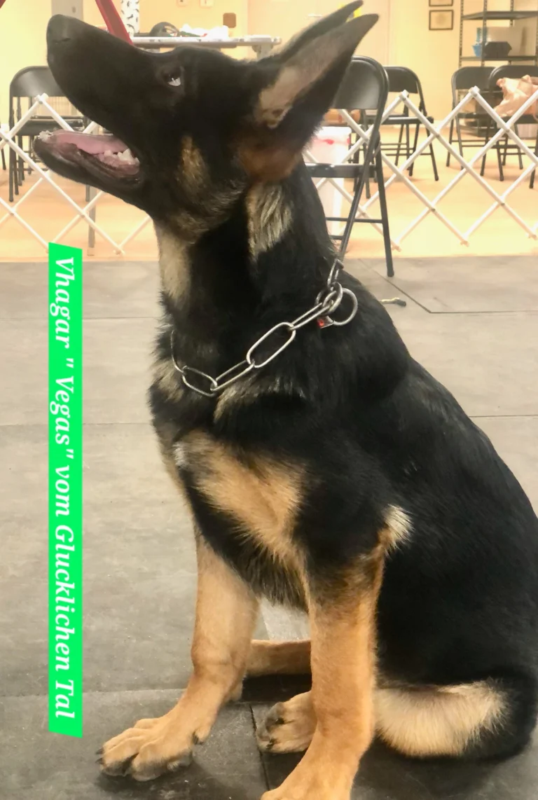 “Vegas” like his siblings is the culmination of German genetics infused throughout Happy Valley Kennel’s breeding program. Mischa vom Glücklichen Tal, Valena’s mother, is a daughter of SG1 James von Ungalant IGP 3, KK who was imported from Germany at 10 weeks. James “Mr. Bond” is owner Krista Wade’s IGP competition K9 having competed in several national competitions at the IGP 3 level. Her mother Melle vom Heidikotton, was also imported from Germany at the same times as Mr. Bond. Melle possesses wonderful maternal instincts. She is a loyal German Shepherd. She is agile, quick, loves the water & has ball drive. Both Mr. Bond & Melle are DM negative, SV “a” Stamp hips & normal elbows. They have exceptional temperaments & dispositions, coupled with drive. Mischa is a balance of both Melle & Mr. Bond and is currently competing in AKC obedience.